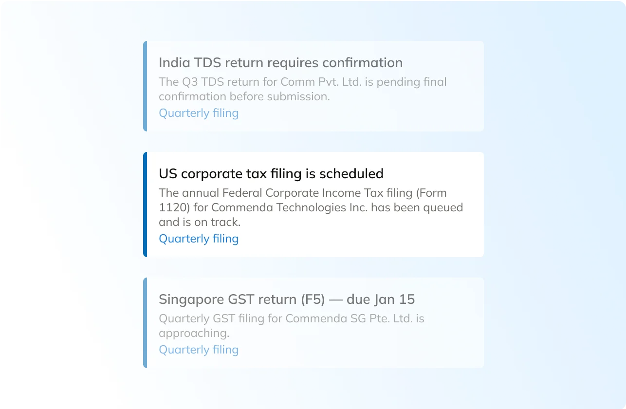 Commenda unifies your compliance data across jurisdictions — so your finance and legal teams share one accurate, real-time view of filings, renewals, and obligations worldwide. Audit-ready all the time.